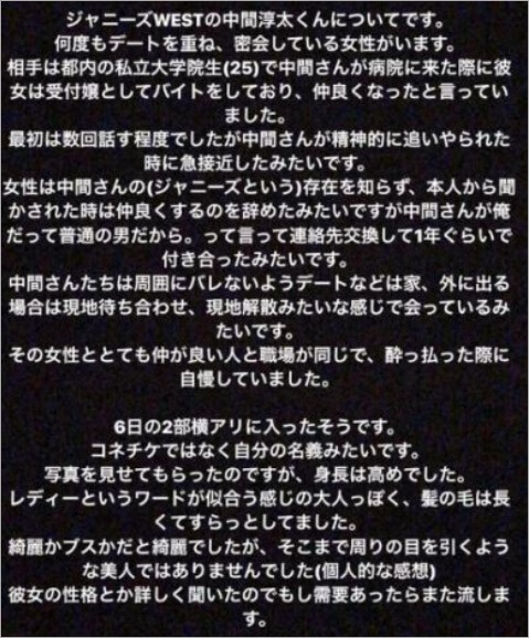 「中間淳太さんには何度もデートしている女性がいる」「お相手は大学院生の25歳」などと詳しく書かれたSNSの投稿があったことから噂になりました。