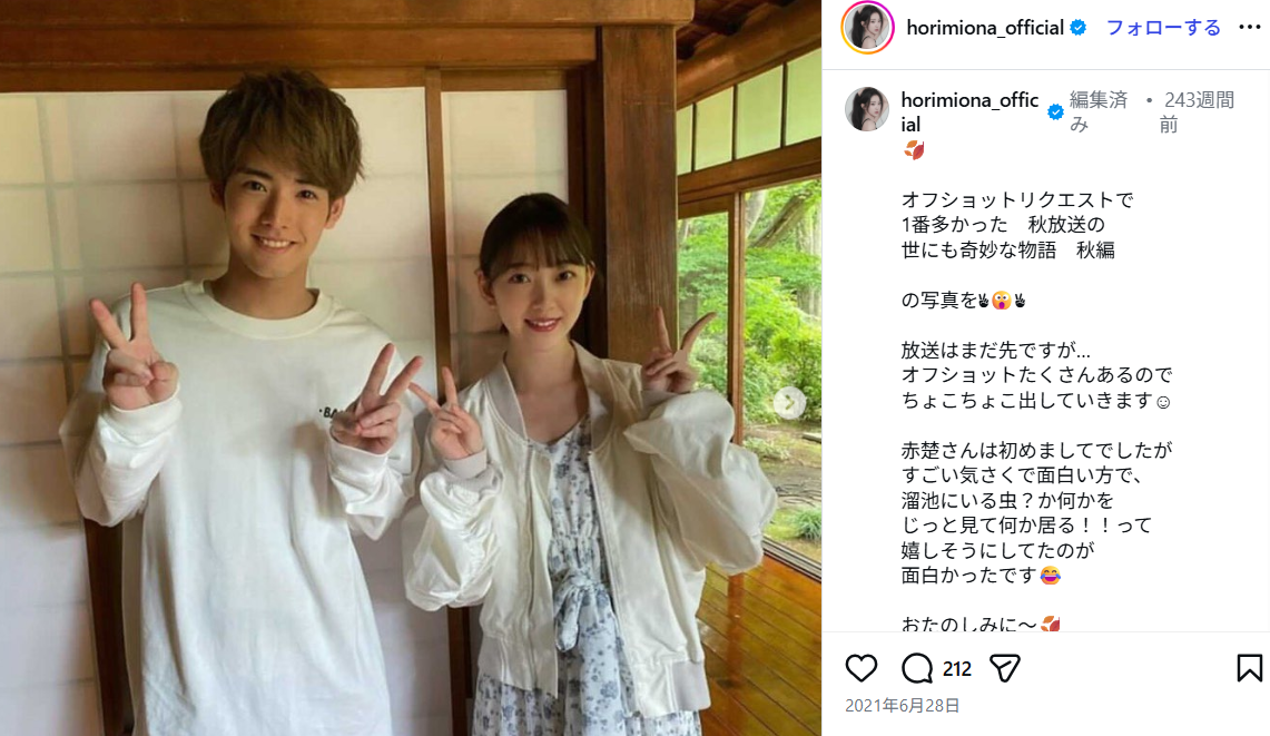 さらに、堀さんはInstagramで撮影裏話を披露し、「初めましてでしたが、赤楚さんは気さくで面白い方。溜池の虫を見て“何かいる!”と嬉しそうにしていて可愛かった」とコメント。